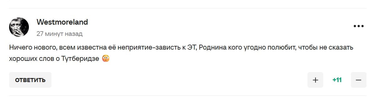 "Ничего нового, всем известна ее неприятие-зависть к ЭТ, Роднина кого угодно полюбит, чтобы не сказать хороших слов о Тутберидзе", – пишут в комментариях.