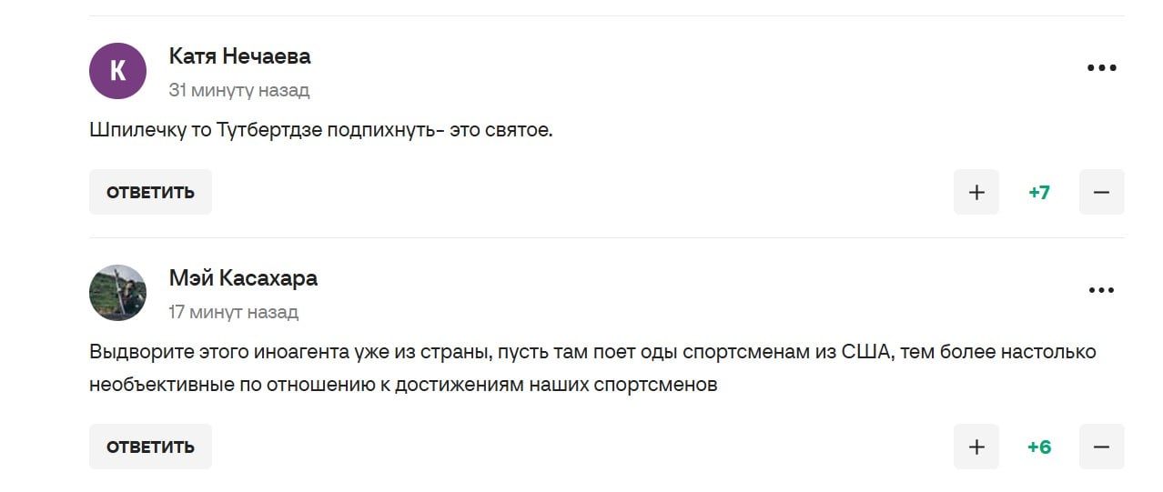 "Выдворите этого иноагента уже из страны, пусть там поет оды спортсменам из США, тем более настолько необъективные по отношению к достижениям наших спортсменов", – написал один из таких "патриотов" в комментарии к новости о словах Родниной о Лю на одном из спортивных порталов России.