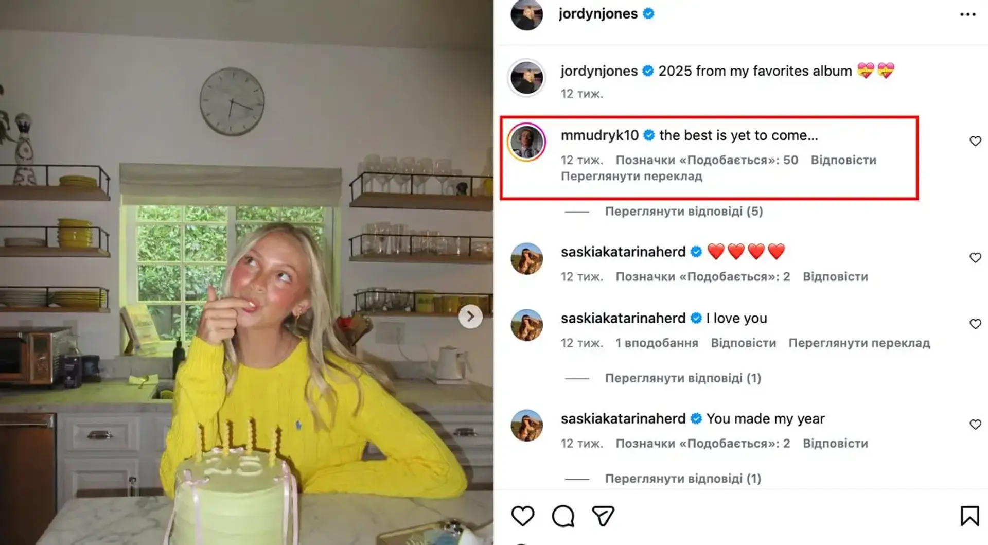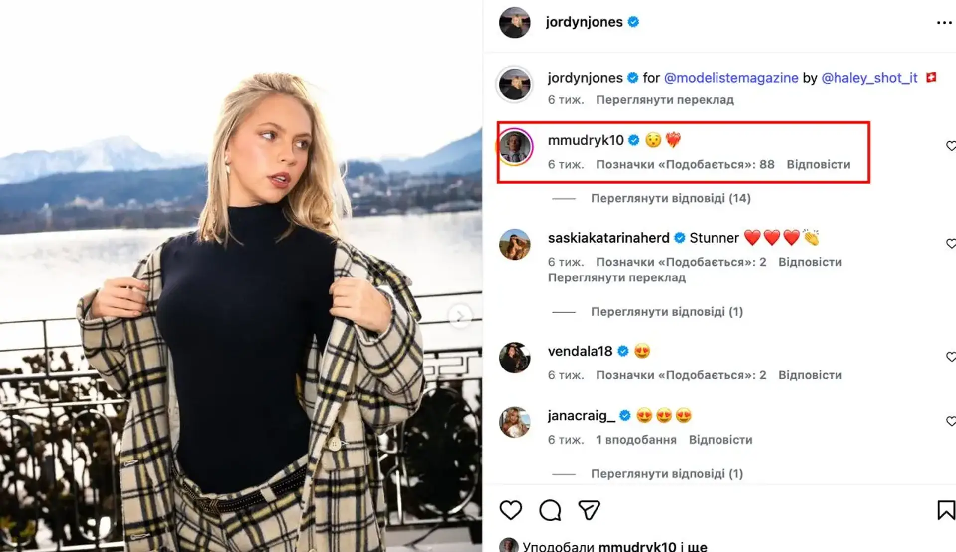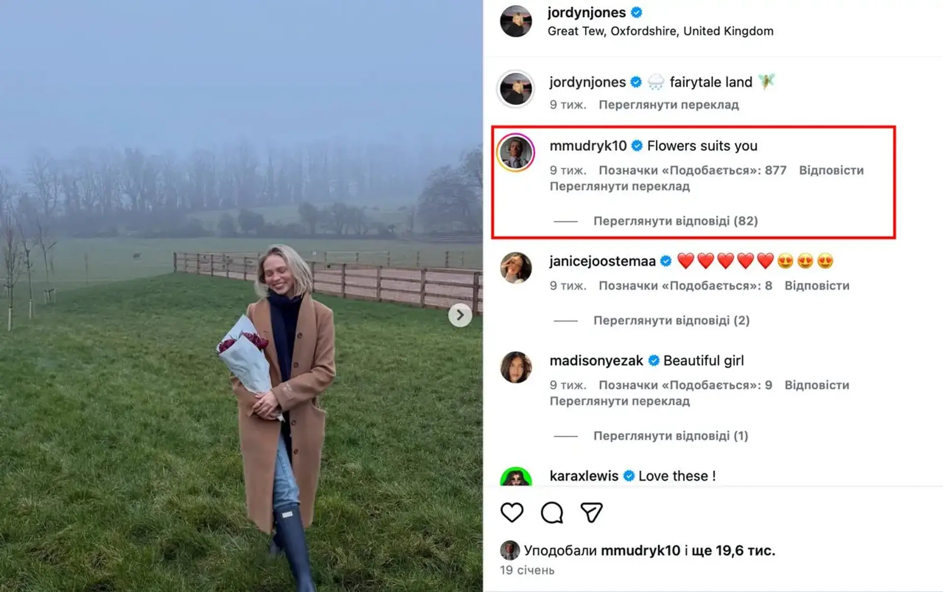 По данным СМИ, Мудрик начал активно общаться с Джонс в соцсетях еще в 2025 году, комментируя ее публикации и приглашая на встречу в Париже. Позже появились фотографии и видео, где они проводят время вместе в Париже и Лондоне, что усилило слухи о романе.